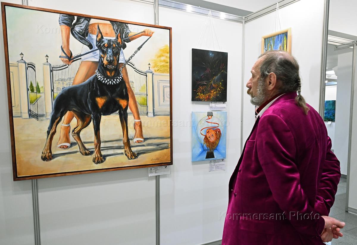 Международная выставка-конкурс современного искусства "Российская неделя искусств" в конгресс-холле "Амбер-плаза". Посетитель на выставке.