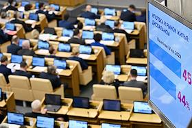 Пленарное заседание Государственной думы (ГД) России. Член комитета ГД России по просвещению Эльвира Аиткулова (в центре) и член комитета ГД России по безопасности и противодействию коррупции Бийсултан Хамзаев (слева) во время заседания.