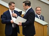 Пленарное заседание Государственной думы (ГД) России. Член комитета ГД России по экономической политике Виктор Казаков (второй слева) и член комитета ГД России по транспорту и развитию транспортной инфраструктуры Роман Романенко (в центре) во время заседания.