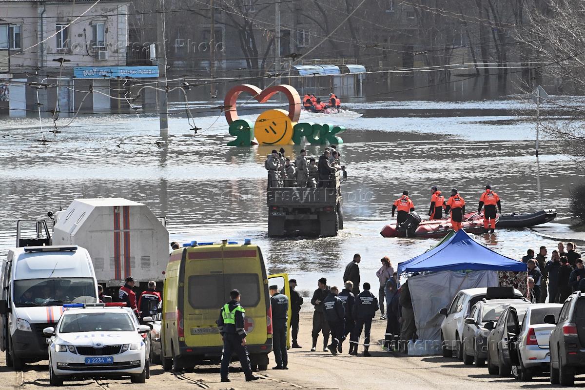 Consequences of a dam break in Orsk. Genre photography. Rescue services during the evacuation of local residents from the flood zone.