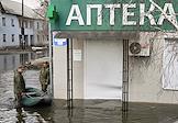 Consequences of a dam break in Orsk. Genre photography. Flooded areas of the city. Pharmacy on the ground floor of an apartment building.