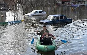 Consequences of a dam break in Orsk. Genre photography. Flooded areas of the city. Local residents in a boat at the Pedestrian Crossing road sign. Monument to the Il-28 aircraft.