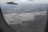 Consequences of a dam break in Orsk. View of the flooded areas of the city from the airplane window.
