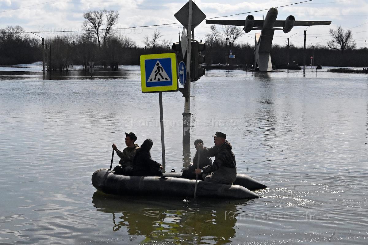 Consequences of a dam break in Orsk. Genre photography. Flooded areas of the city. Local residents in a boat at the Pedestrian Crossing road sign. Monument to the Il-28 aircraft.