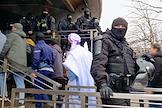 Праздничные мероприятия в день Ураза Байрам у Соборной мечети Санкт-Петербурга. Сотрудники правоохранительных органов у мечети перед началом богослужения.