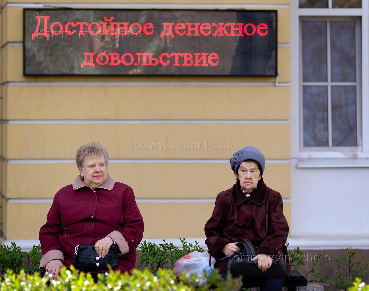 Жанровая фотография. Пожилые женщины сидят на фоне надписи "Достойное денежное довольствие".