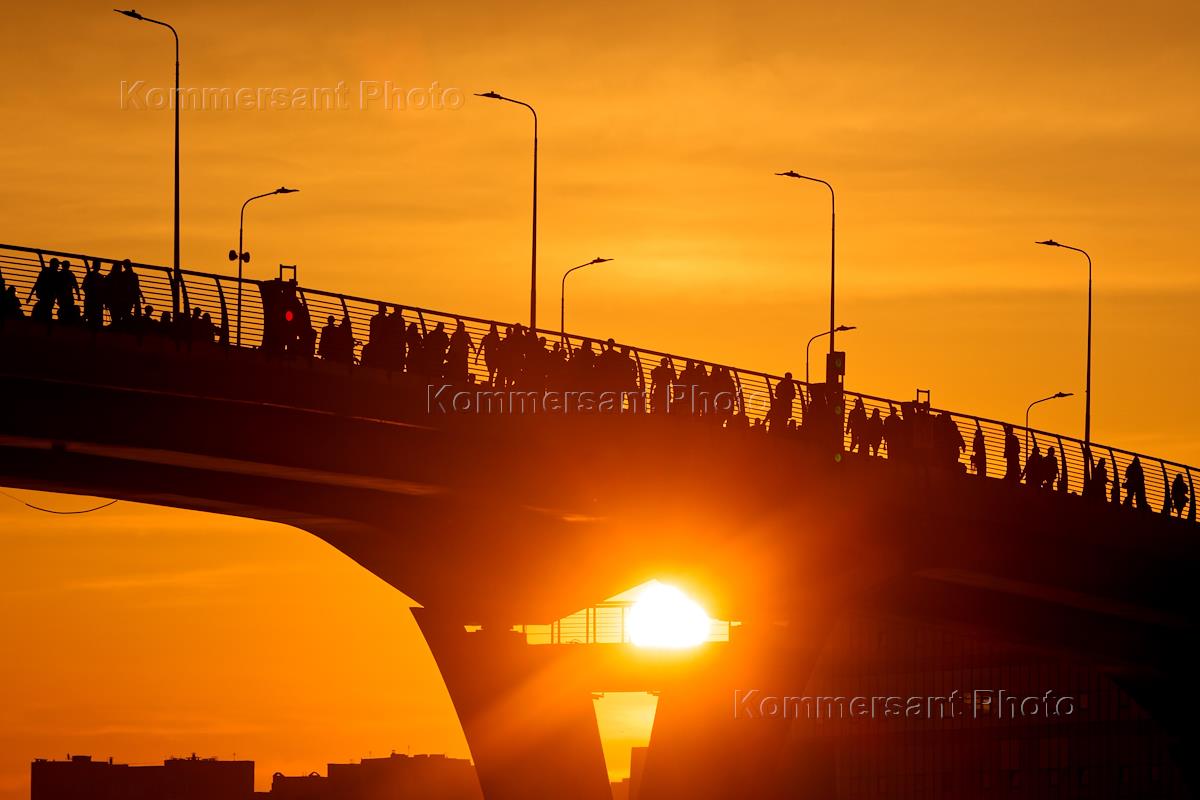 Виды Санкт-Петербурга. Жанровая фотография. Жители города идут по пешеходному мосту на фоне заходящего солнца.