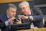 Пленарное заседание Государственной Думы (ГД) России. Первые заместители председателя комитета ГД России по безопасности и противодействию коррупции Рахим Азимов (слева) и Андрей Луговой (справа) во время заседания.