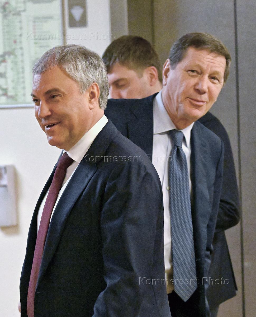 Пленарное заседание Государственной Думы (ГД) России. Председатель ГД России Вячеслав Володин (слева) и первый заместитель председателя ГД России Александр Жуков (справа) во время заседания.