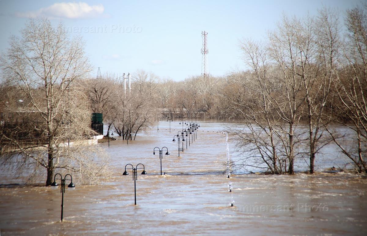 Consequences of flood in Orenburg. Genre photography. Flooded city streets.