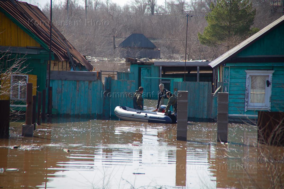 Consequences of flood in Orenburg. Genre photography. Rescuers on a rubber inflatable boat on a flooded street in the Sitsovka area.