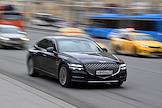 Автомобили класса "люкс" на дорогах города. Жанровая фотография. Логотип автомобиля Genesis на багажнике.