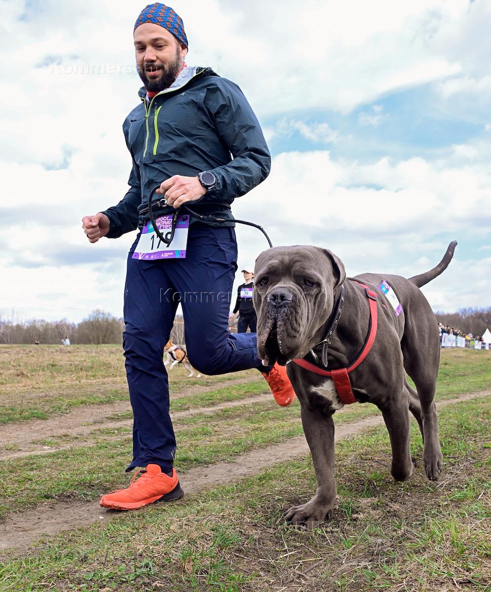 Race with dogs - cross-country "Fast Dog" in the Bitsevsky Forest park. Participants during the race.