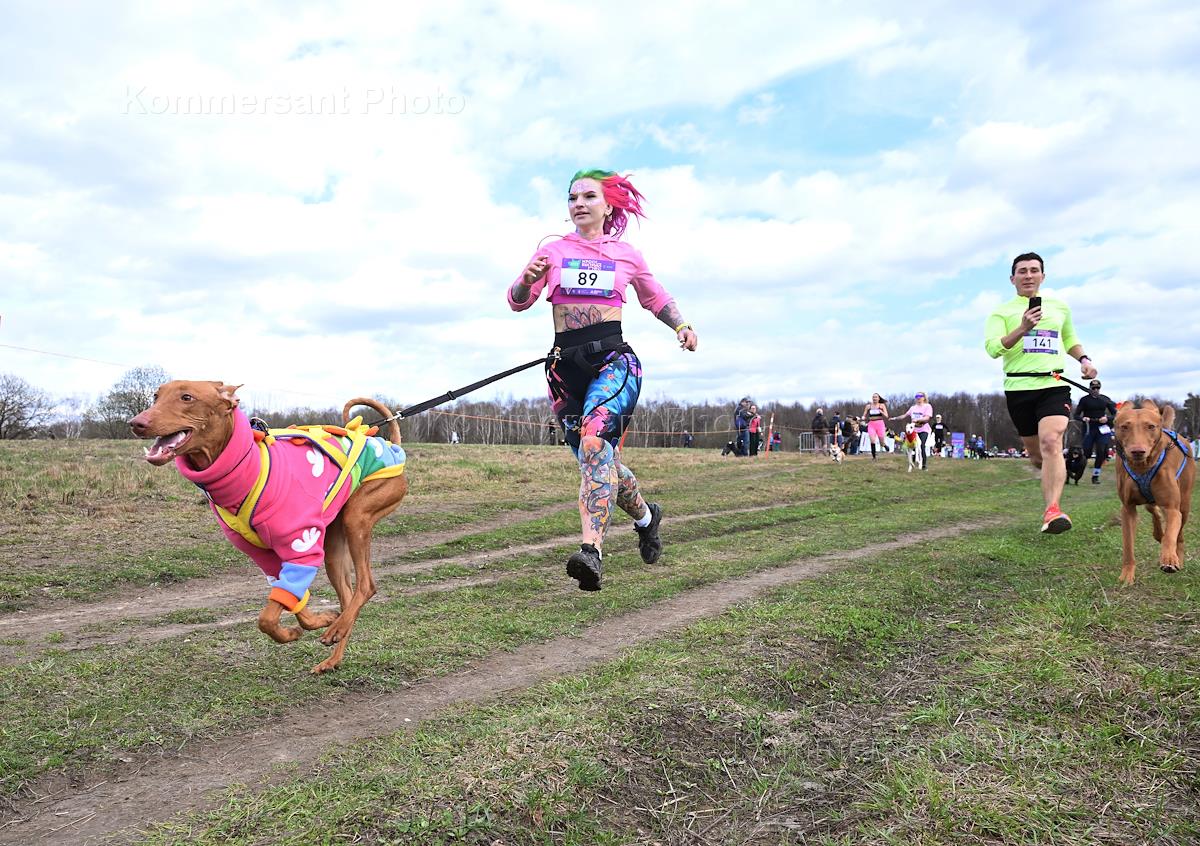 Race with dogs - cross-country "Fast Dog" in the Bitsevsky Forest park. Participants during the race.
