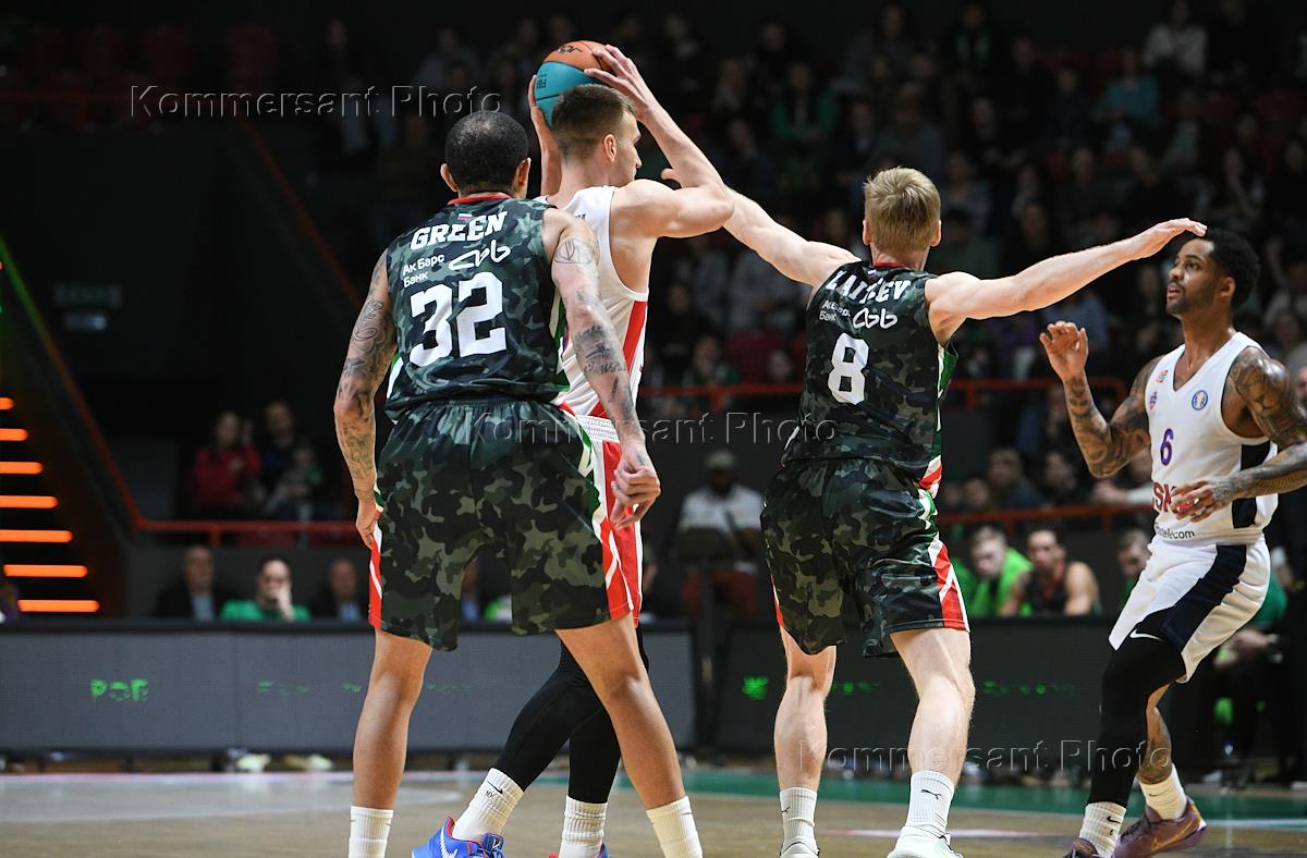 Единая лига ВТБ по баскетболу 2023/2024. Матч между командами УНИКС (Казань) и ЦСКА (Москва) на стадионе "Баскет-холл". Игрок команды ЦСКА Никита Курбанов (в центре) во время матча.
