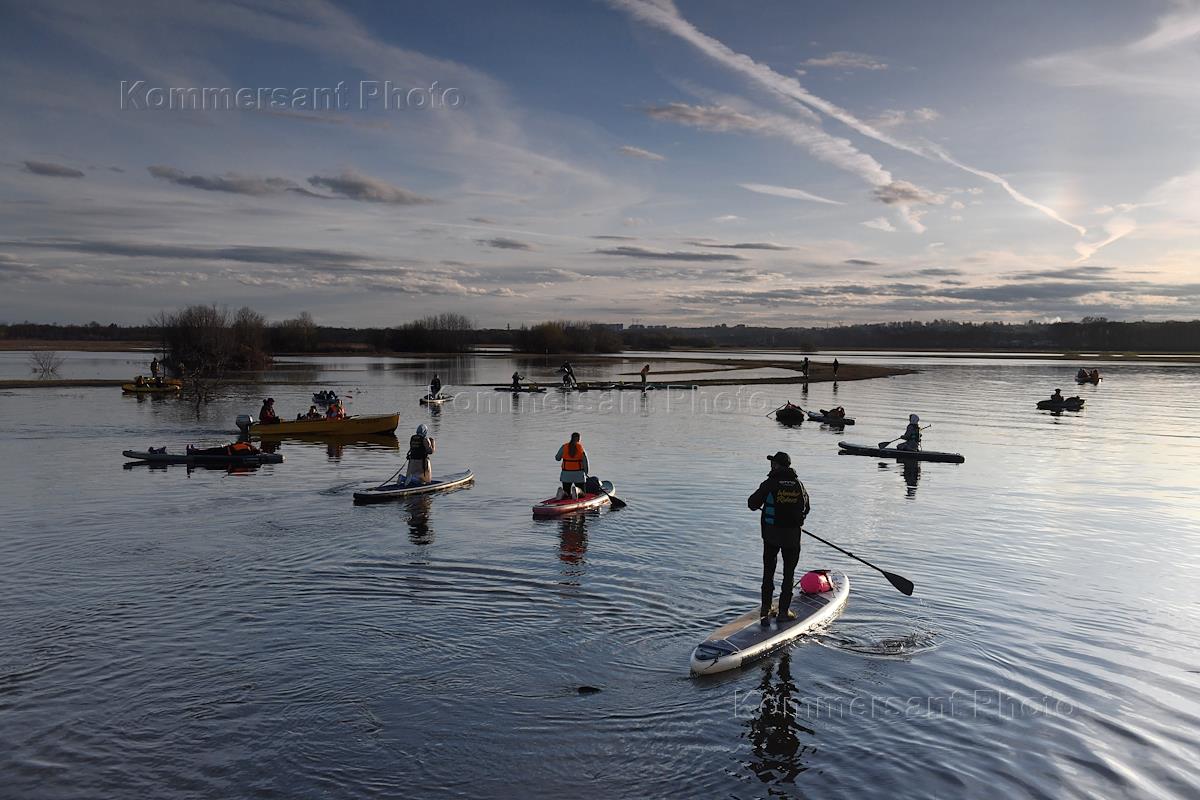 Высокое половодье во Владимирской области. Разлив на реках Нерль и Клязьма. Туристы на байдарках, надувных лодках и сап-бордах возле церкви Покрова на Нерли во время половодья.