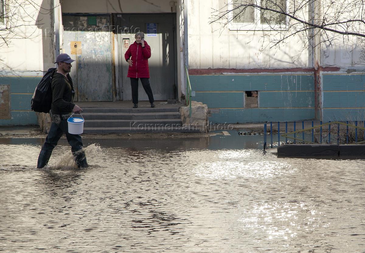 Consequences of flooding in the Aviagorodok microdistrict. Flooded area near multi-storey residential buildings. A man carries packages of drinking water on the street along the water.