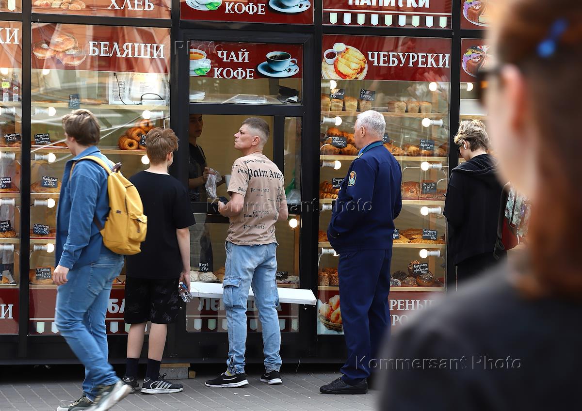 Виды Санкт-Петербурга. Жанровая фотография. Люди стоят в очереди в продуктовый ларек со свежей выпечкой.
