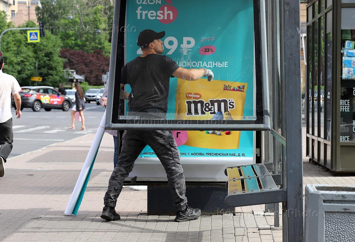 Виды Санкт-Петербурга. Жанровая фотография. Рабочий обновляет рекламу на информационном щите автобусной остановки.