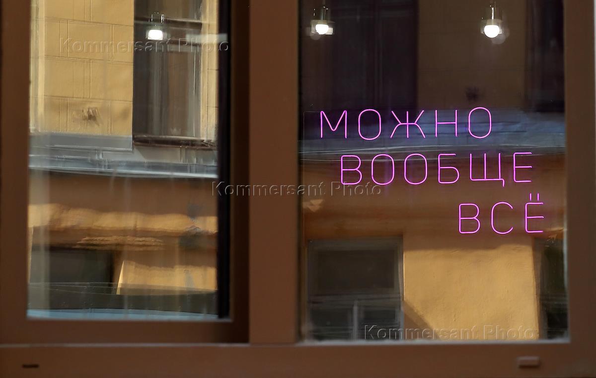 Views of St. Petersburg. Genre photography. Glowing neon inscription “Anything is possible” in a beauty salon.