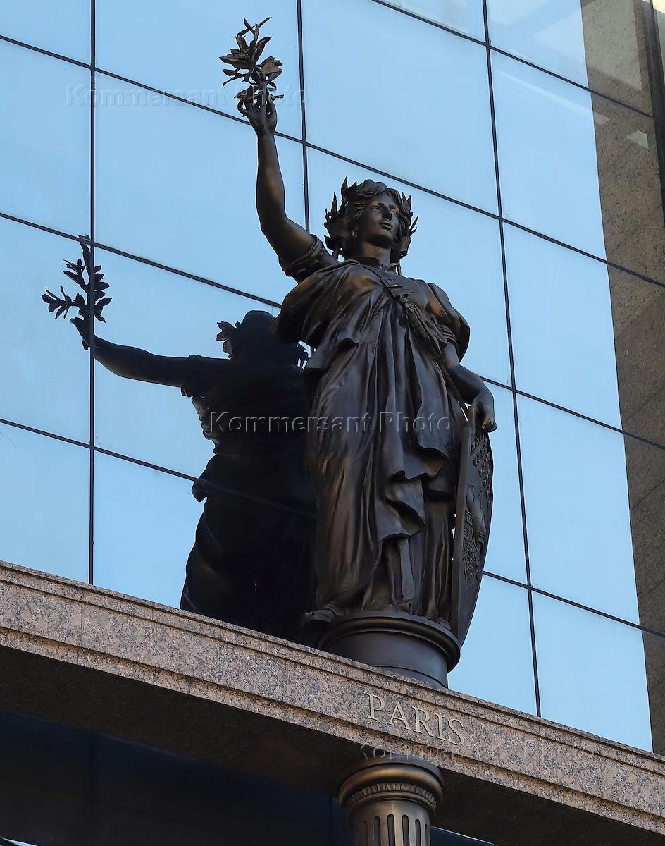 Views of St. Petersburg. Genre photography. A sculpture symbolizing Paris on the wall of the non-operating mothballed shopping complex "Europe" on the Petrograd side.