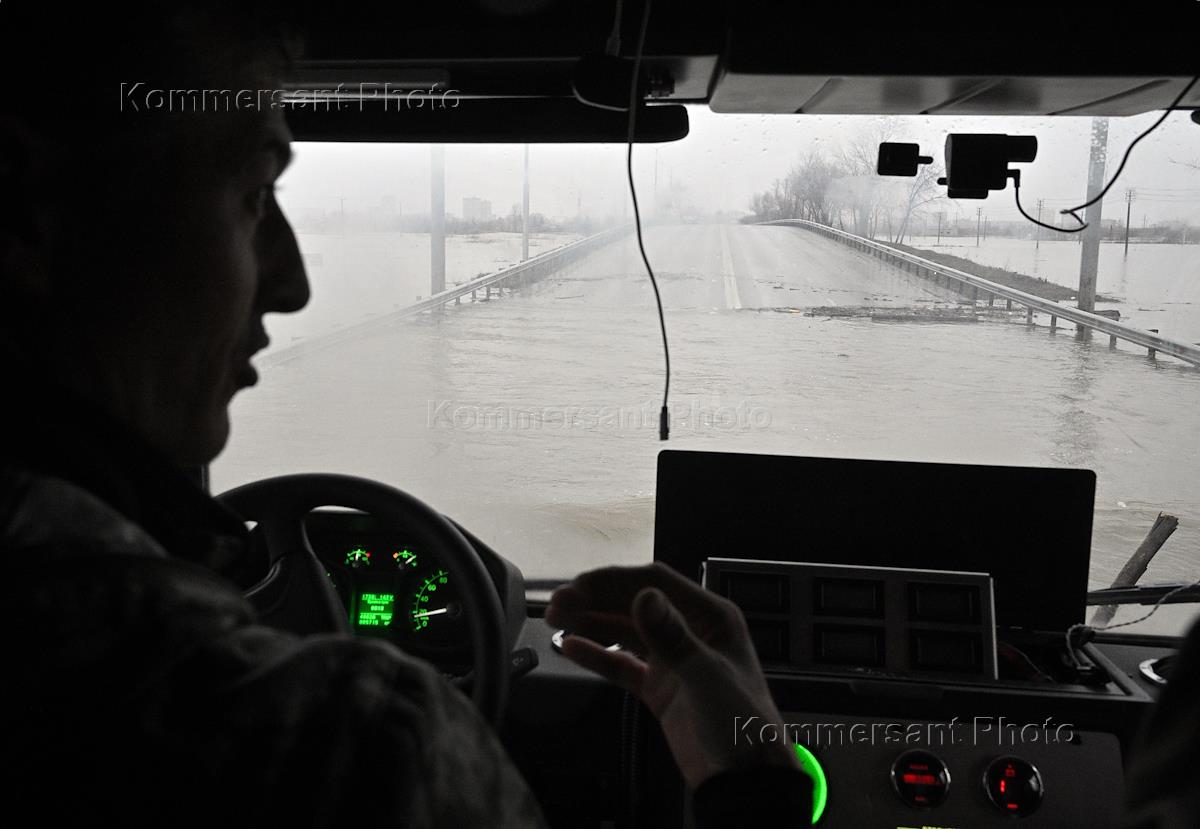 Последствия наводнения в Кургане. Жанровая фотография. Сотрудники МЧС России в автомобиле на фоне перелива реки Тобол через шоссе.