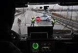 Последствия наводнения реки Тобол в Кургане. Жанровая фотография. Сотрудники дорожно-патрульной службы (ДПС) перекрывают шоссе шлагбаумом.