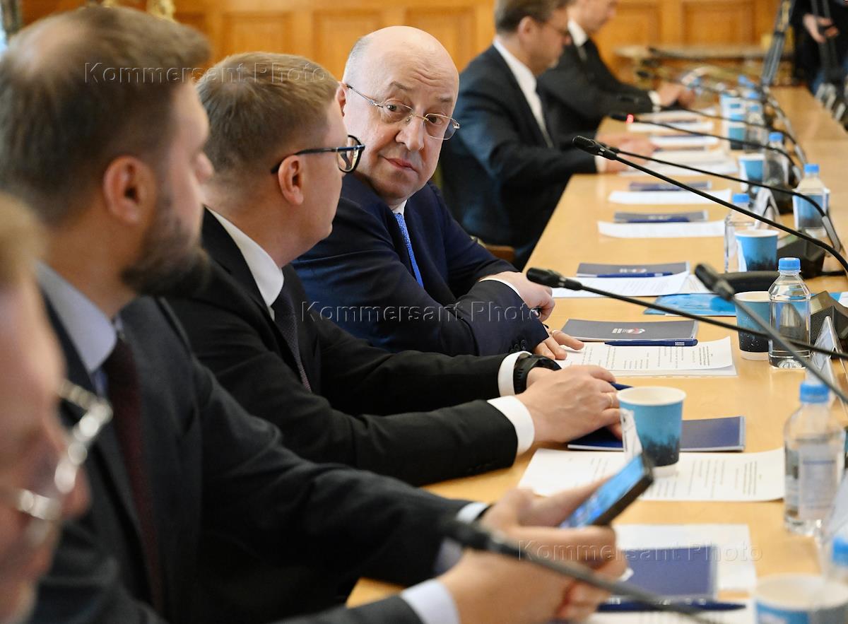 Meeting of the Commission of the General Council of the United Russia party on international cooperation and support of compatriots abroad at the Reception House of the Russian Foreign Ministry. From right to left: co-chairman of the Association of Lawyers of Russia (ARA) Vladimir Pligin, governor of the Chelyabinsk region Alexey Teksler and deputy chairman of the Russian State Duma Committee on Affairs of the Commonwealth of Independent States, Eurasian integration and relations with compatriots Artem Turov before the start of the meeting.