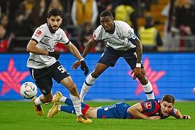 Фонбет - Кубок России по футболу 2023/24. 1/4 финала. Матч между командами ЦСКА (Москва) - "Балтика" (Калининград) на стадионе "ВЭБ Арена". Игрок команды ЦСКА Федор Чалов (слева) и игрок команды "Балтика" Александр Осипов (в центре) во время матча.