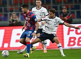 Фонбет - Кубок России по футболу 2023/24. 1/4 финала. Матч между командами ЦСКА (Москва) - "Балтика" (Калининград) на стадионе "ВЭБ Арена". Игрок команды ЦСКА Саша Зделар (справа) и игрок команды "Балтика" Дмитрий Рыбчинский (слева) во время матча.