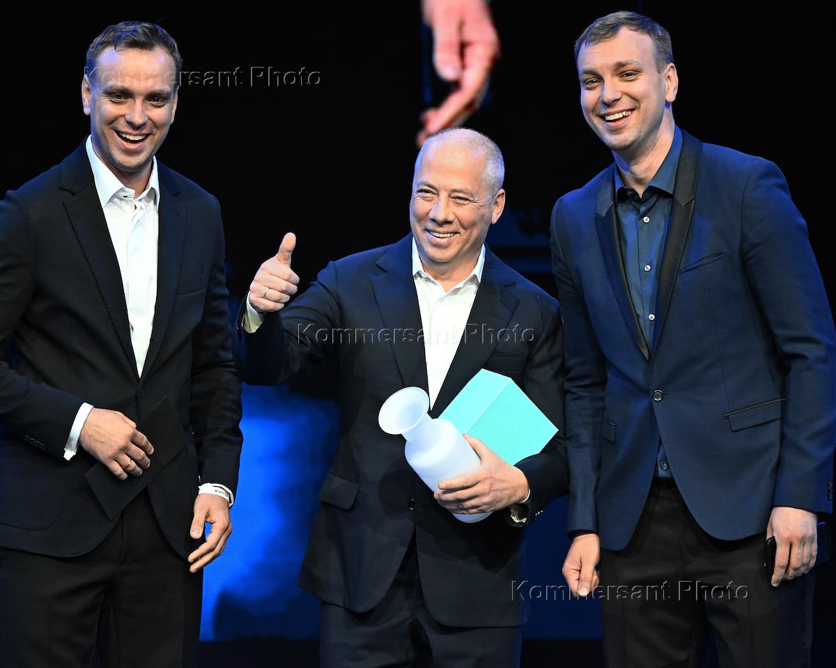 Церемония награждения Национальной ресторанной премии "Wheretoeat Russia 2024" в Концертном зале "Зарядье". Рестораторы Иван и Сергей Березуцкие и Аркадий Новиков (в центре) во время церемонии.