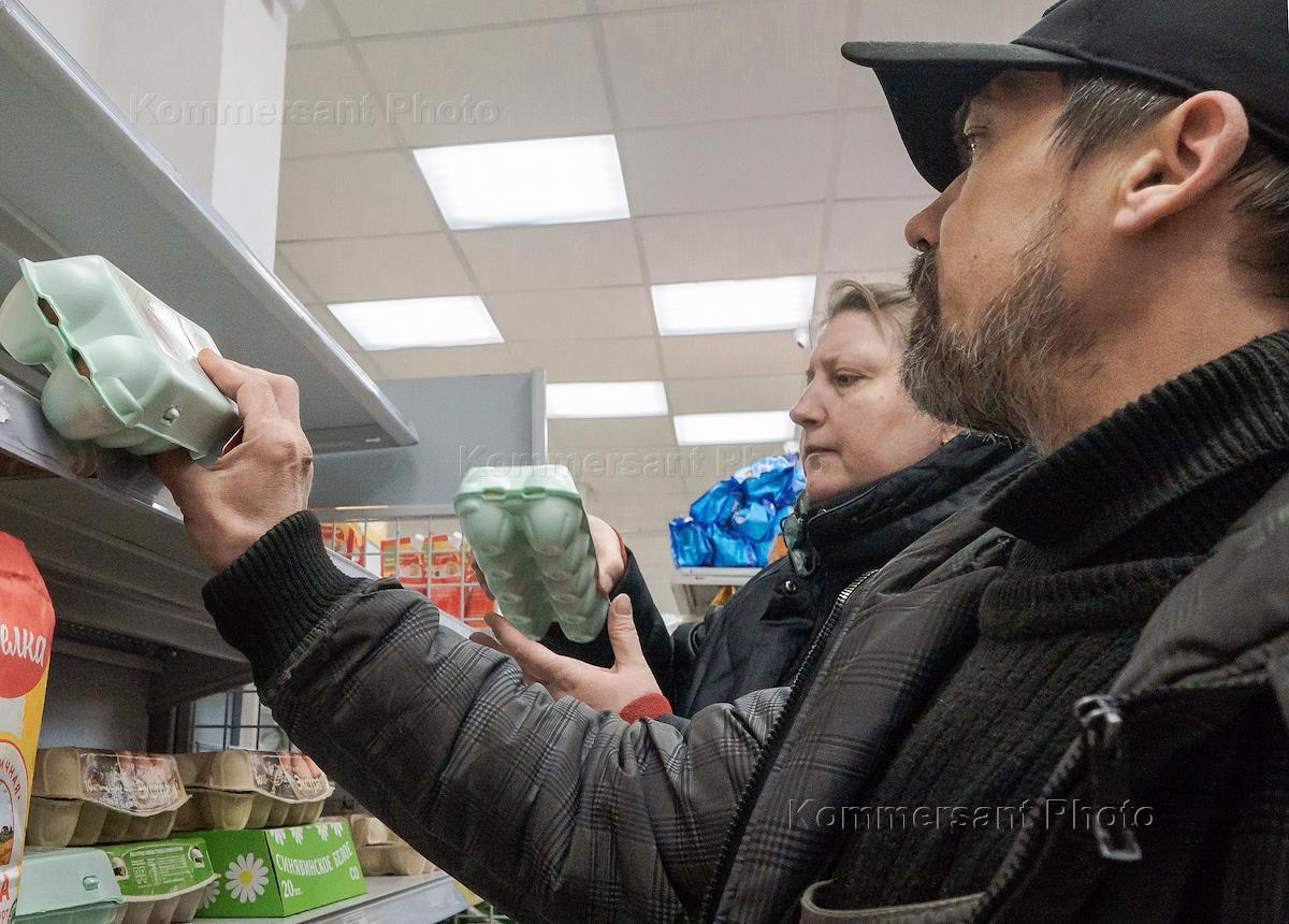 Жанровая фотография. Покупатели выбирают куриные яйца в супермаркете торговой сети "Пятерочка".