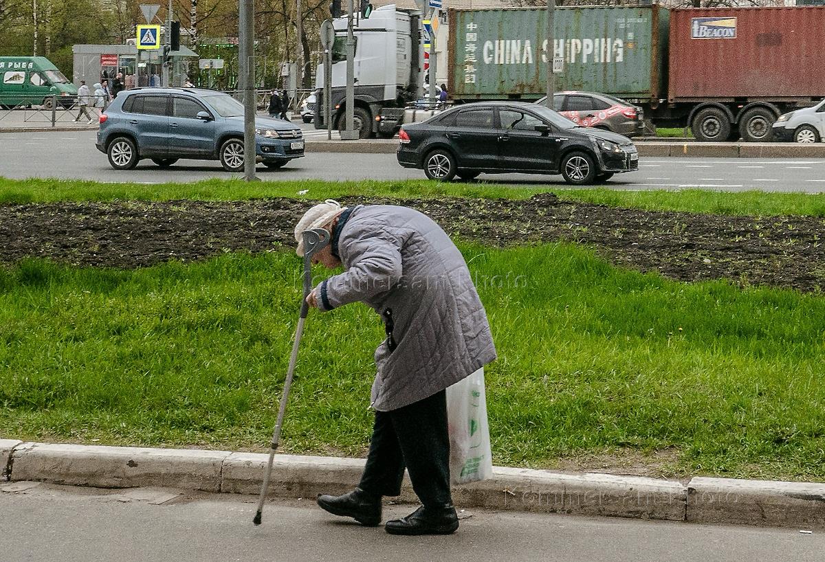 Жанровая фотография. Пожилая женщина с палочкой на улице.