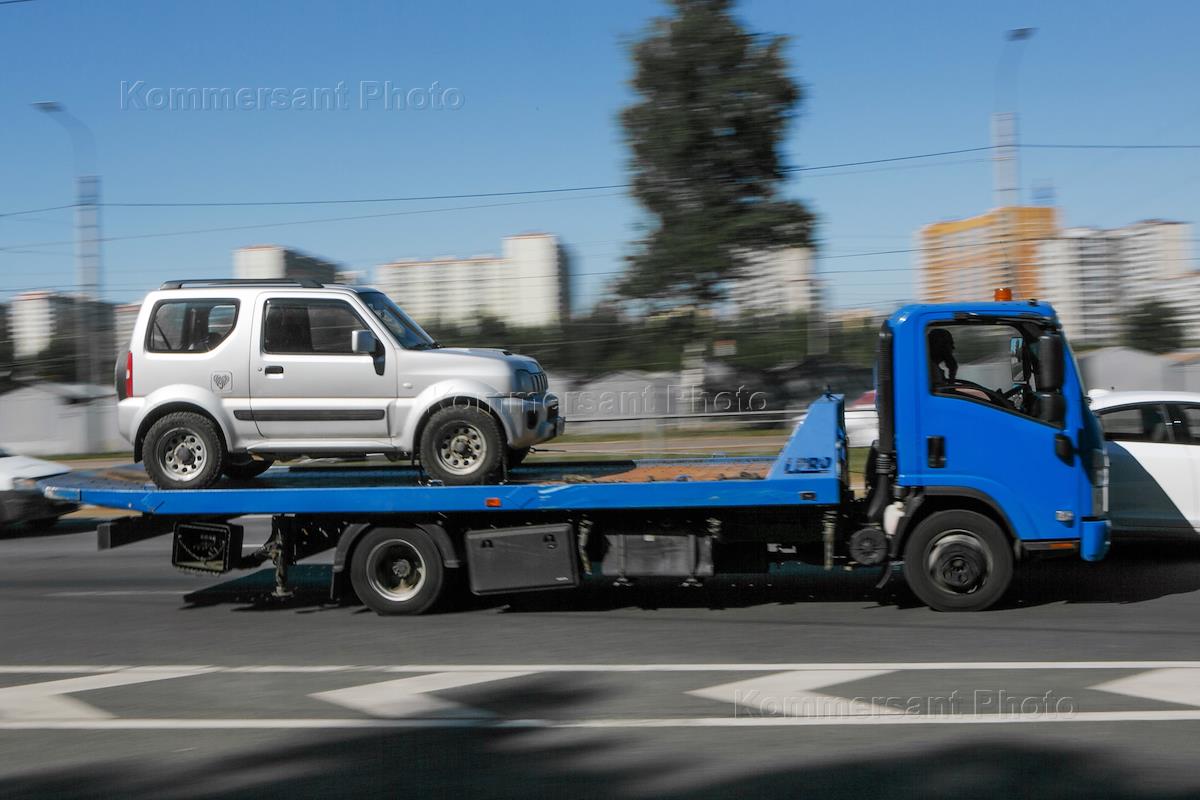 Виды Санкт-Петербурга. Жанровая фотография. Дорожное движение на улицах города. Эвакуатор во время перевозки автомобиля.