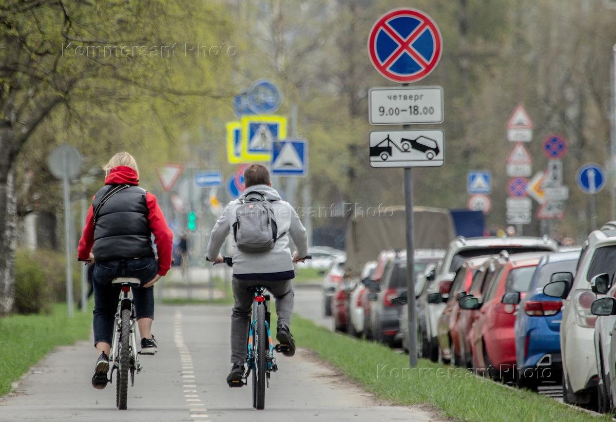 Жанровая фотография. Люди едут на велосипеде по велодорожке в городе.