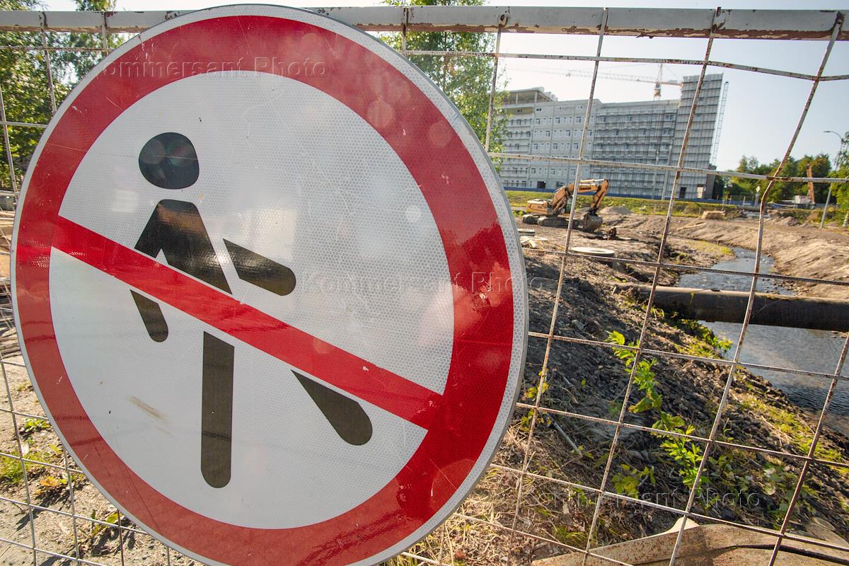 Виды Петрозаводска. Жанровая фотография. Дорожный знак "Движение пешеходов запрещено" и вид на строительную площадку с экскаватором.