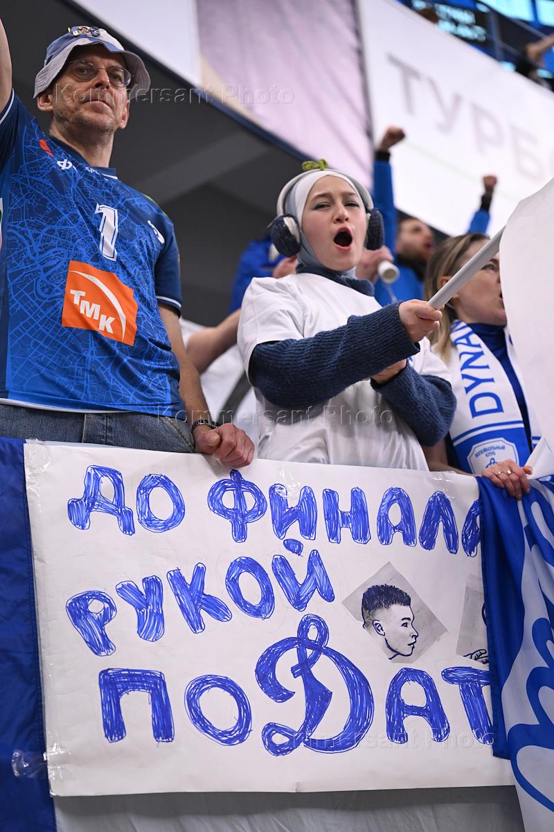 Пари Суперлига по волейболу - плей-офф. 1/2 Финала. Матч между командами "Динамо М" (Москва) - "Белогорье" (Белгород) на волейбольной арене "Динамо". Болельщики команды "Динамо М" на зрительской трибуне во время матча.