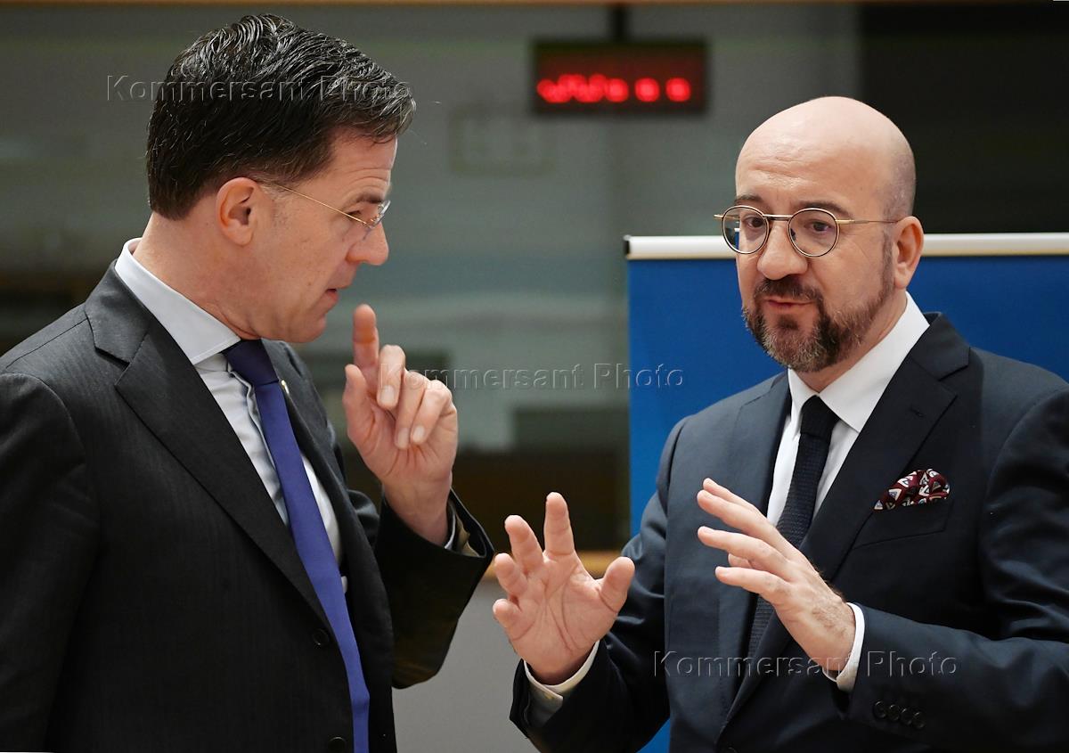 Саммит Европейского Совета (ЕС) в Брюсселе. Председатель Европейского совета Шарль Мишель (справа) и премьер-министр Нидерландов Марк Рютте (слева) во время саммита.