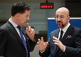 Саммит Европейского Совета (ЕС) в Брюсселе. Председатель Европейского совета Шарль Мишель (справа) и премьер-министр Нидерландов Марк Рютте (слева) во время саммита.