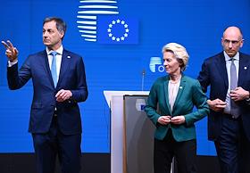 Саммит Европейского Совета (ЕС) в Брюсселе. Слева направо: премьер-министр Бельгии Александр Де Кроо, председатель Европейской комиссии Урсула фон дер Ляйен и бывший премьер-министр Италии Энрико Летта на саммите.
