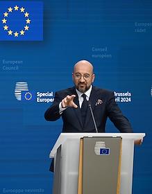 Саммит Европейского Совета (ЕС) в Брюсселе. Председатель ЕС Шарль Мишель на саммите.
