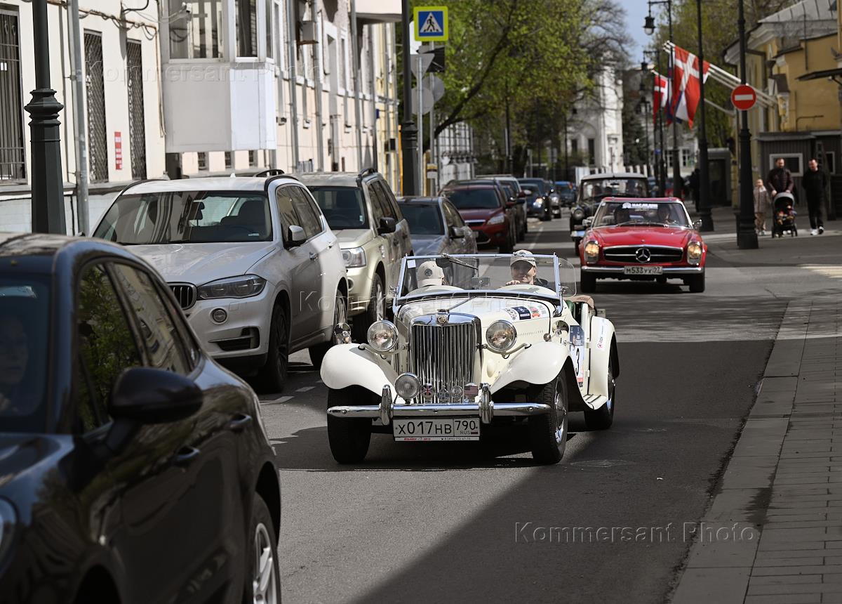 Церемония открытия 9-ого сезона Кубка Российской автомобильной федерации по ралли на классических автомобилях. Старт автопробега ралли "Столица" в парке "Музеон". Участники во время автопробега.