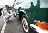 Церемония открытия 9-ого сезона Кубка Российской автомобильной федерации по ралли на классических автомобилях. Старт автопробега ралли "Столица" в парке "Музеон". Участник во время подготовки автомобиля перед стартом.