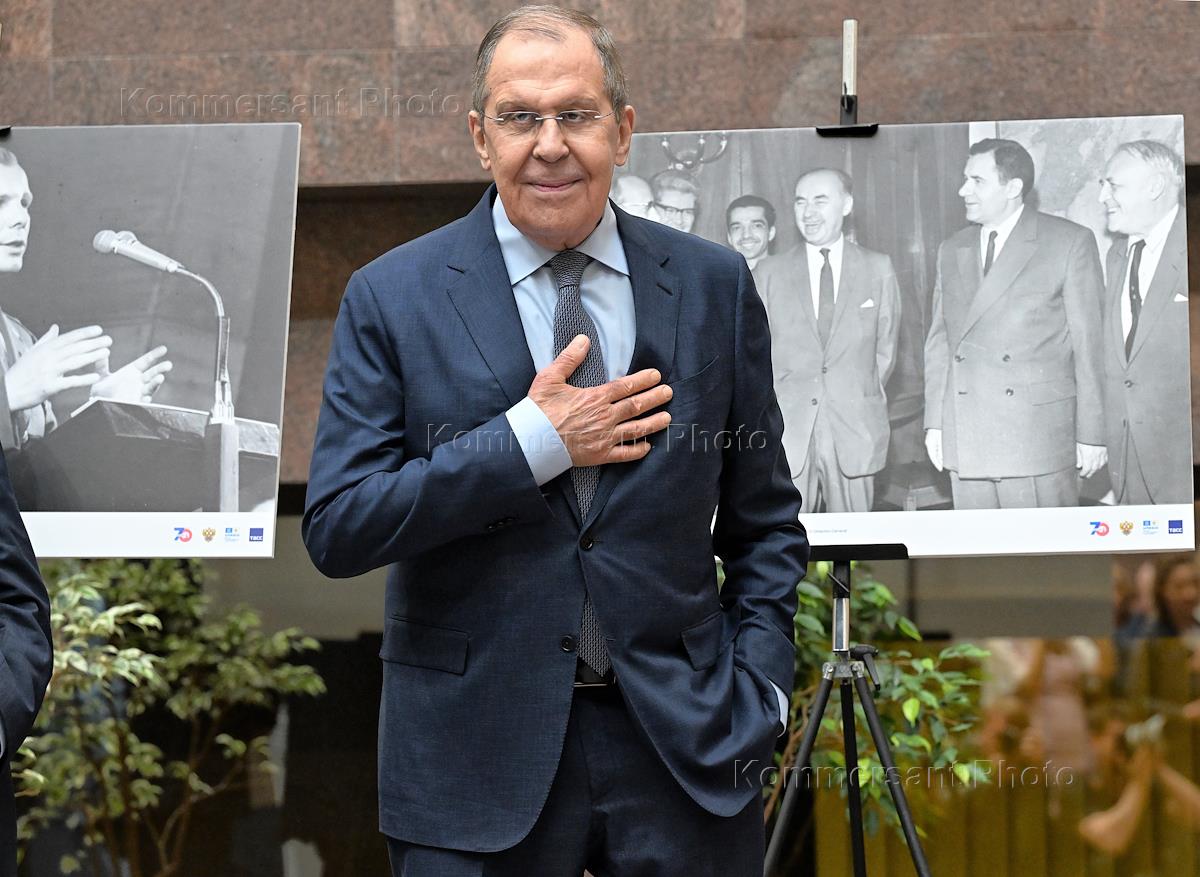 Церемония открытия фотодокументальной выставки, посвященной 70-летию присоединения России (СССР) к Организации Объединенных Наций по вопросам образования, науки и культуры (ЮНЕСКО), в здании Министерства иностранных дел (МИД) России. Министр иностранных дел России Сергей Лавров во время церемонии.