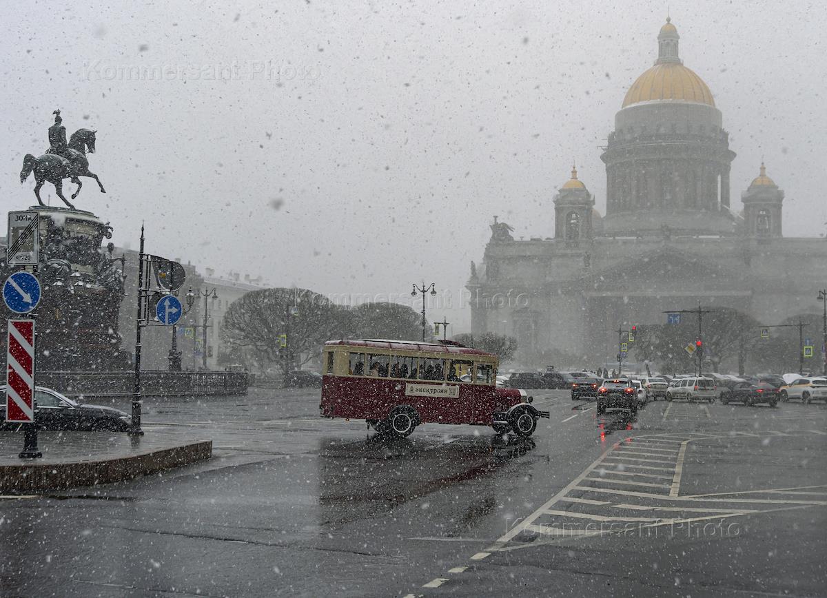 Виды Санкт-Петербурга. Жанровая фотография. Апрельский снегопад в городе. Исаакиевская площадь.