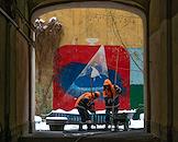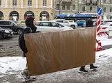 Виды Санкт-Петербурга. Жанровая фотография. Апрельский снегопад в городе. Рабочие ГУП "Водоканал Санкт-Петербурга" во время работы на Большом проспекте Петроградской стороны.