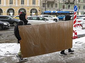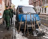 Виды Санкт-Петербурга. Жанровая фотография. Апрельский снегопад в городе. Автомобиль с лопатами для уборки снега на Чкаловском проспекте.