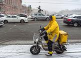 Виды Санкт-Петербурга. Невский проспект. Жанровая фотография. Апрельский снегопад. Курьер сервиса доставки "Яндекс. Еда" на электромопеде.