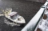 Виды Санкт-Петербурга. Жанровая фотография. Апрельский снегопад в городе. Катер на реке Фонтанке.