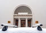 Виды Санкт-Петербурга. Жанровая фотография. Апрельский снегопад в городе. Засыпанный снегом вход в здание Академии Танца Бориса Эйфмана.